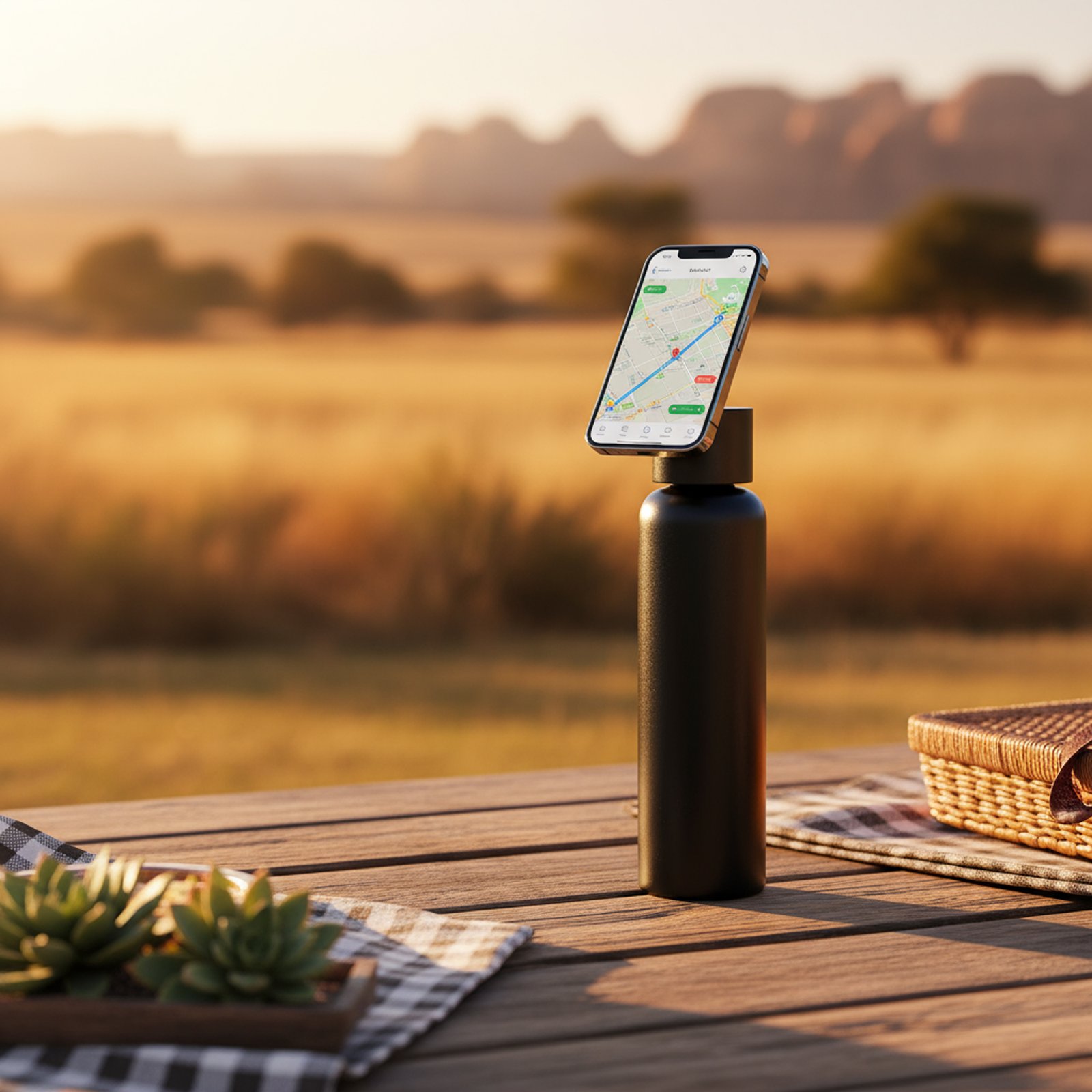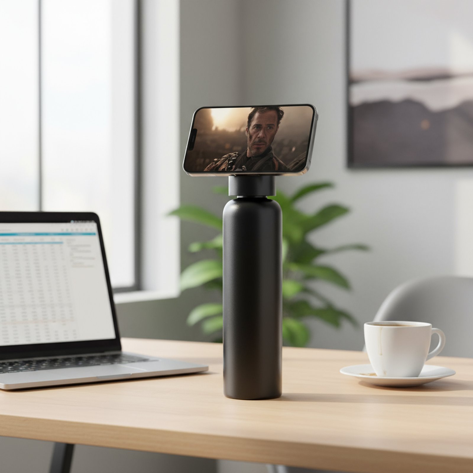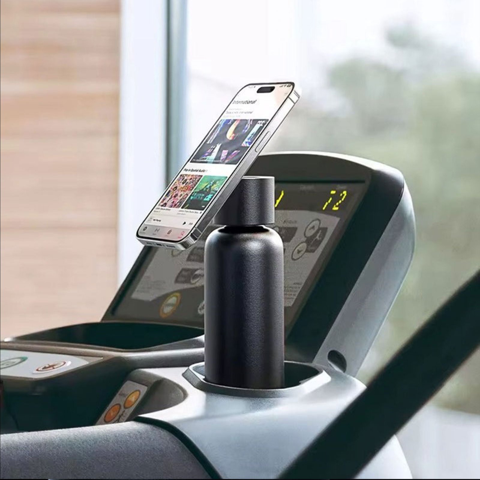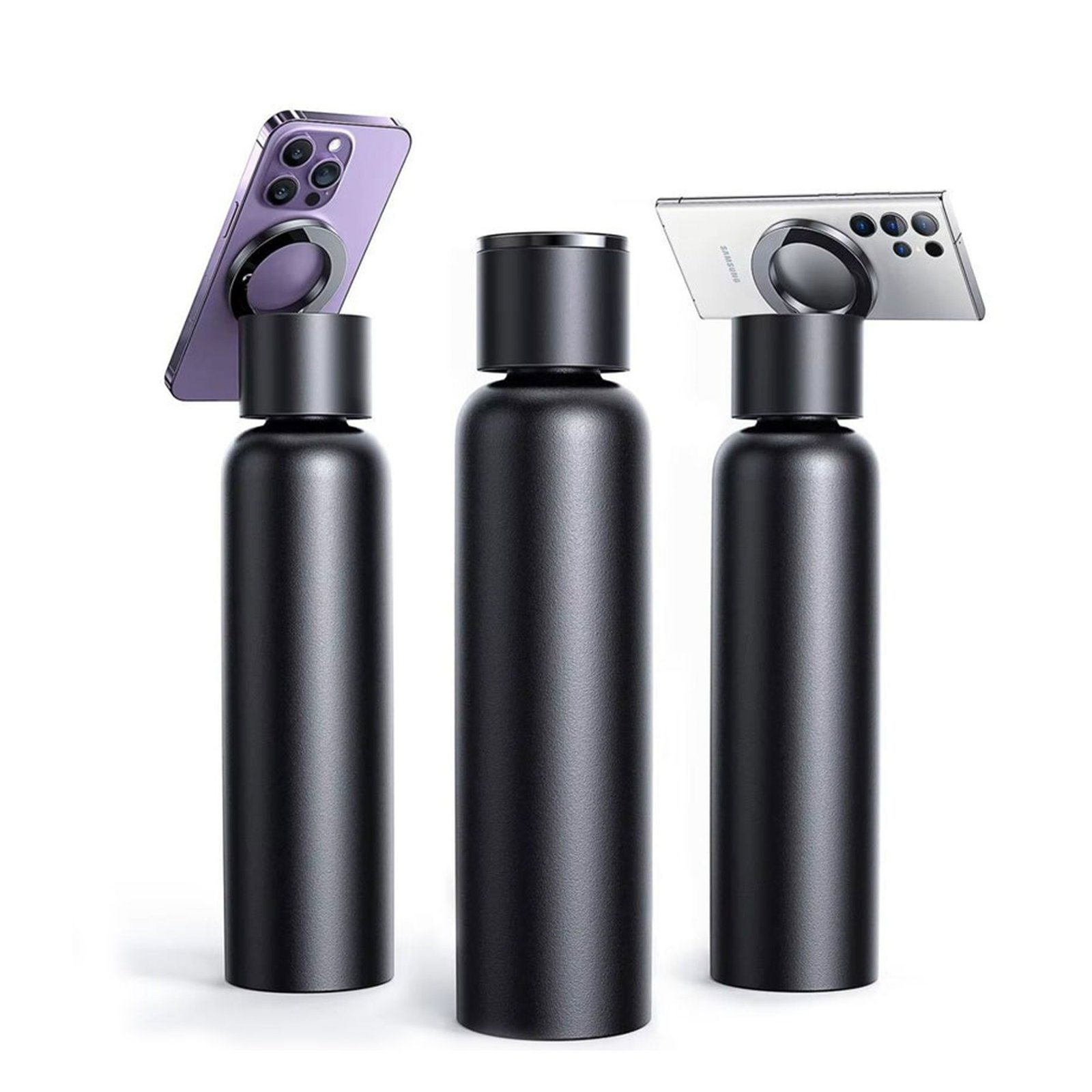 زجاجة مياه رياضية مبتكرة تجمع بين الترطيب وحمل الهاتف بسهولة تصميم ذكي بحامل مغناطيسي يسمح بتدوير الهاتف 360° لمشاهدة مريحة أو التصوير مصنوعة من ستانلس ستيل مزدوج الجدار للحفاظ على حرارة أو برودة المشروبات لفترات طويلة.