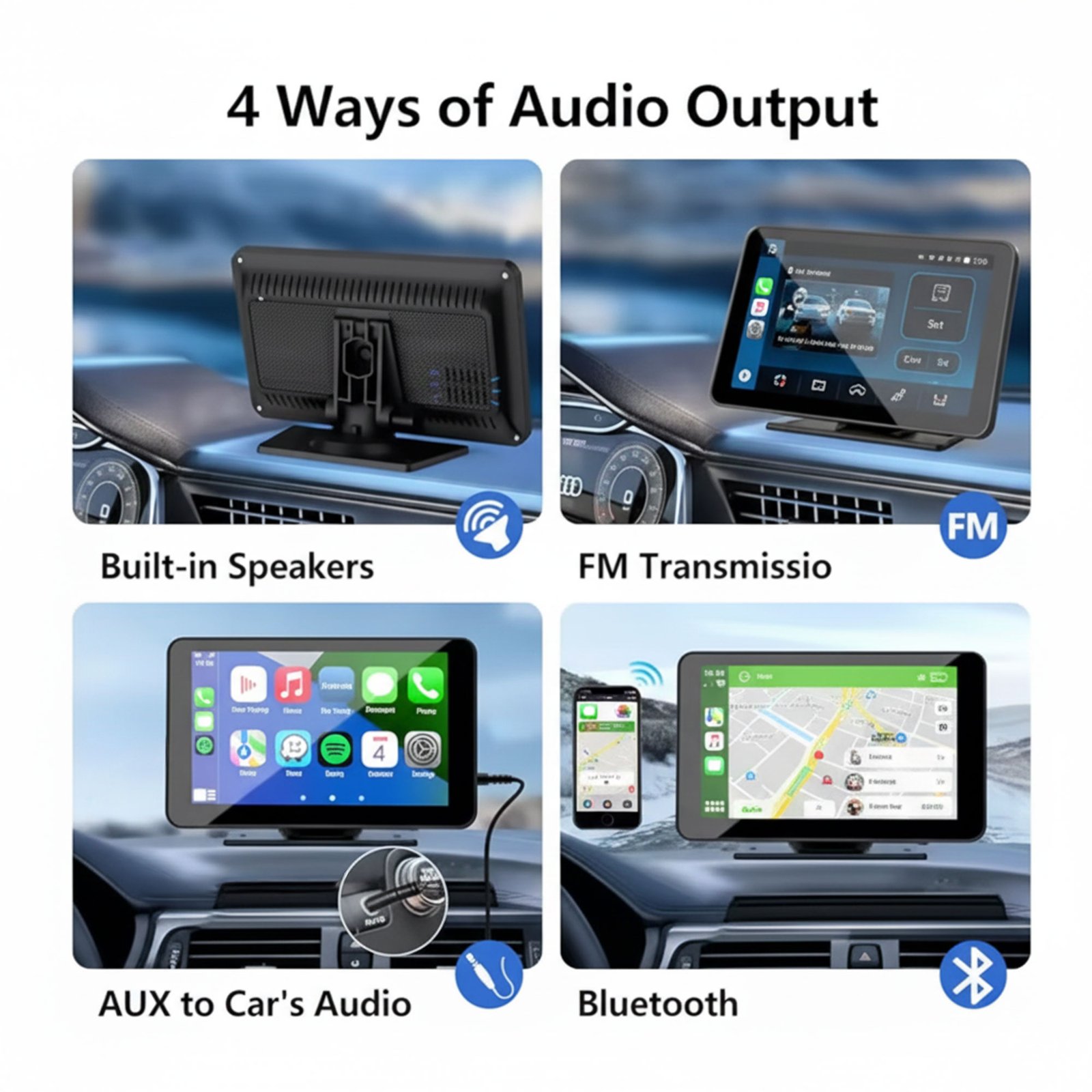 مخرج صوت متعدد: AUX، FM، بلوتوث، مكبر مدمج